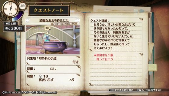 布カテゴリのアイテムを納品(600コール、発想ポイント25、蒸留水のレシピ)→クエスト「綺麗なお水を作るには」発生