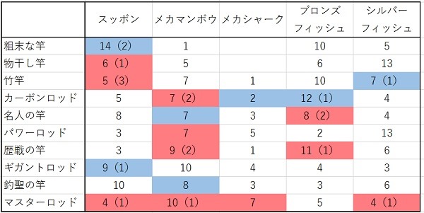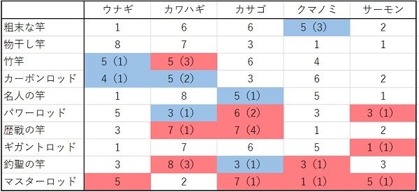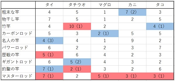 各エサと竿の組み合わせで20~30回試行して、どれが何回釣れたかを表にしてあります。
